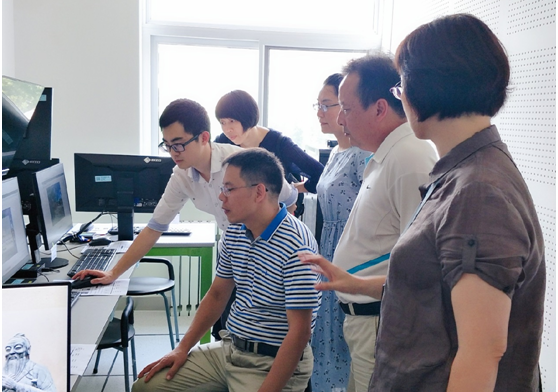 南开大学文学国家级实验教学示范中心主任涂俊教授向考察组介绍了该中心的建设和发展历程,文学仿真实验课程的教学理念和中心特色,以及在实验课程体系、管理模式、课程组建设等方面开展的工作和取得的成果。随后,考察组参观了南开大学文学国家级实验教学示范中心系列实验室,观摩了文学虚拟仿真实验演示,体验了优秀传统文化虚拟仿真实验教学项目,并与各实验室建设与管理人员进行了详细交流与了解。