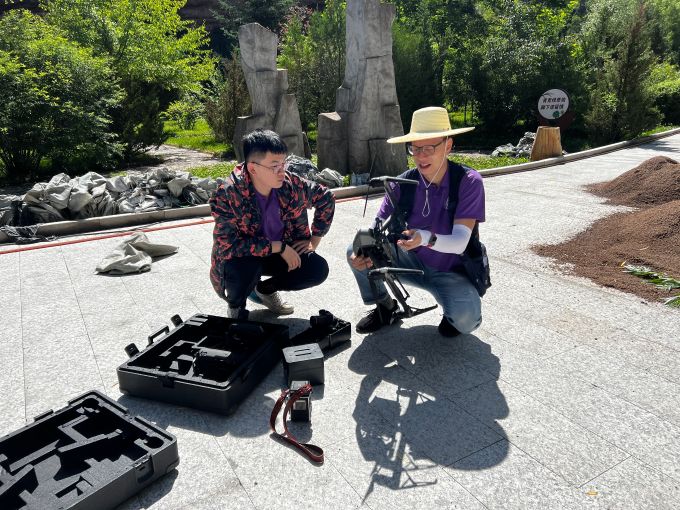 带队教师和实践队员在竹林寺石窟使用无人机