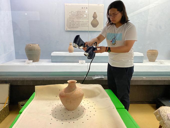 实践队员在庄浪县博物馆使用手持式激光扫描仪工作
